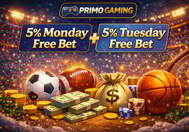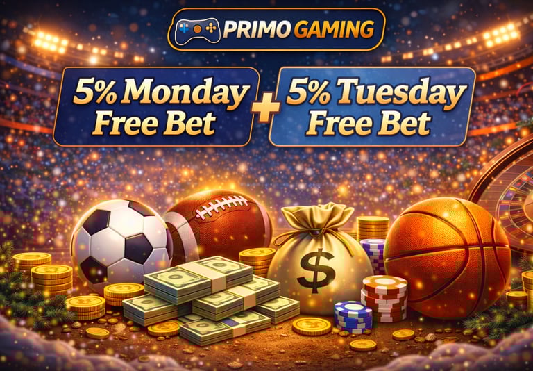 PRIMO GAMING Weekly Momentum Feature: 5% Monday Free Bet + 5% Tuesday Free Bet on December 23, 2025